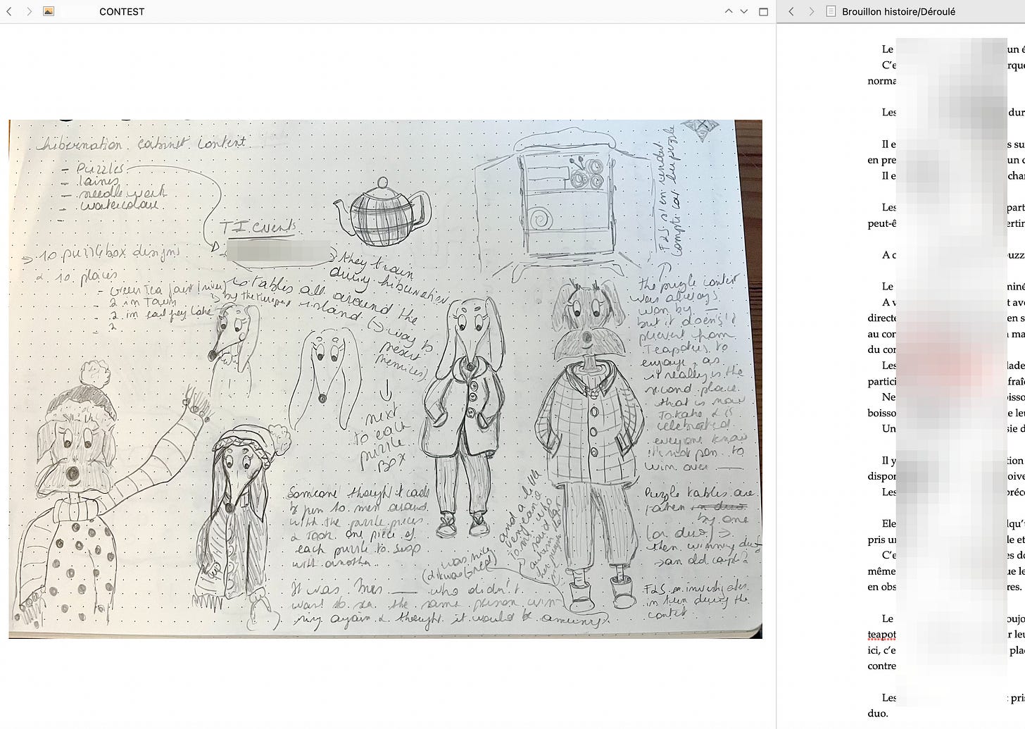 Je peux également y créer des onglets reprenant mes inspirations. Scrivener permet de travailler en double écran, donc je peux écrire avec en parallèle une autre page reprenant les informations dont j’ai besoin. Je ne l’ai pas encore apprivoisé car je suis encore dans la phase de découverte, mais pour l’instant, je suis assez séduite. Pour ceux que ça intéresse, Scrivener est un logiciel à acheter une seule fois (comme Procreate), et ne nécessite pas le paiement d’un abonnement.